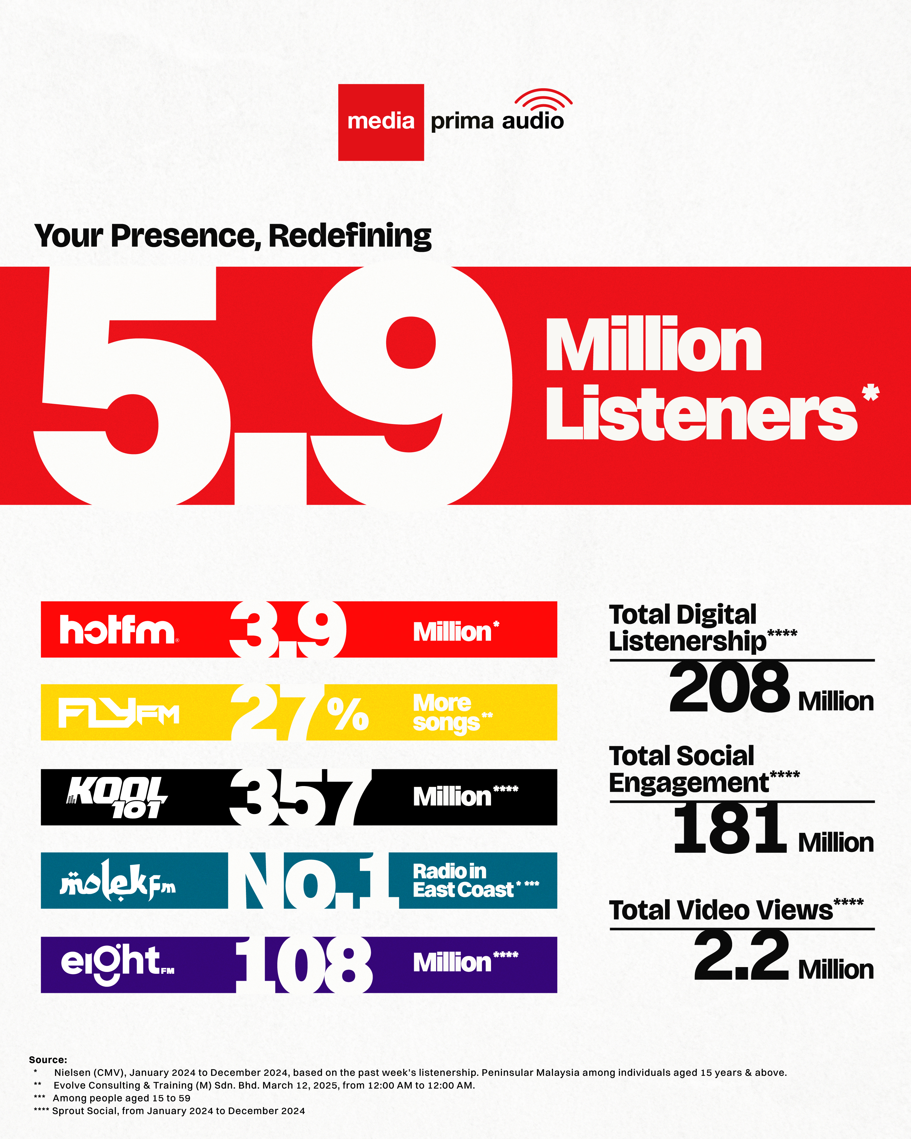 The network continues its upward streak, connecting with diverse listeners through its five major radio brands — Hot FM, Fly FM, Kool 101, Molek FM, and Eight FM — alongside its digital streaming platform, Audio+. By offering content in Malay, English, and Chinese, MPA has positioned itself as the go-to audio destination for Malaysians.