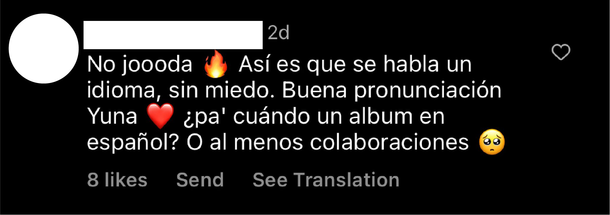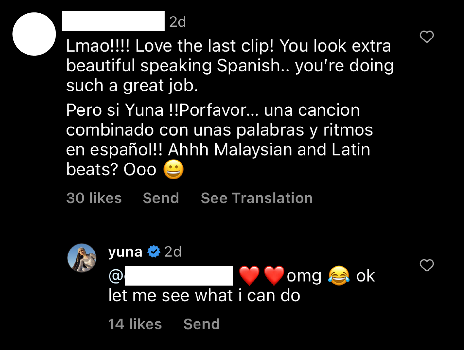 The Spanish text reads: "But Yuna, please… a song combined with a few words and rhythms in Spanish!! Ahhh Malaysian and Latin beats? Ooo"