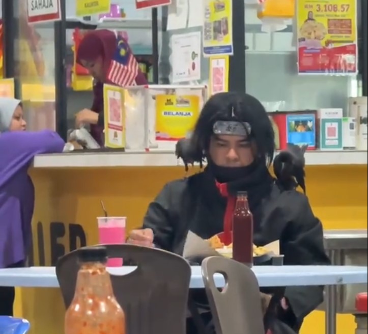 The unusual scene, which was captured in a short clip by TikTok user @i.akmallll, shows the man at a Malaysian food court wearing the character's signature red-and-black Akatsuki robe.