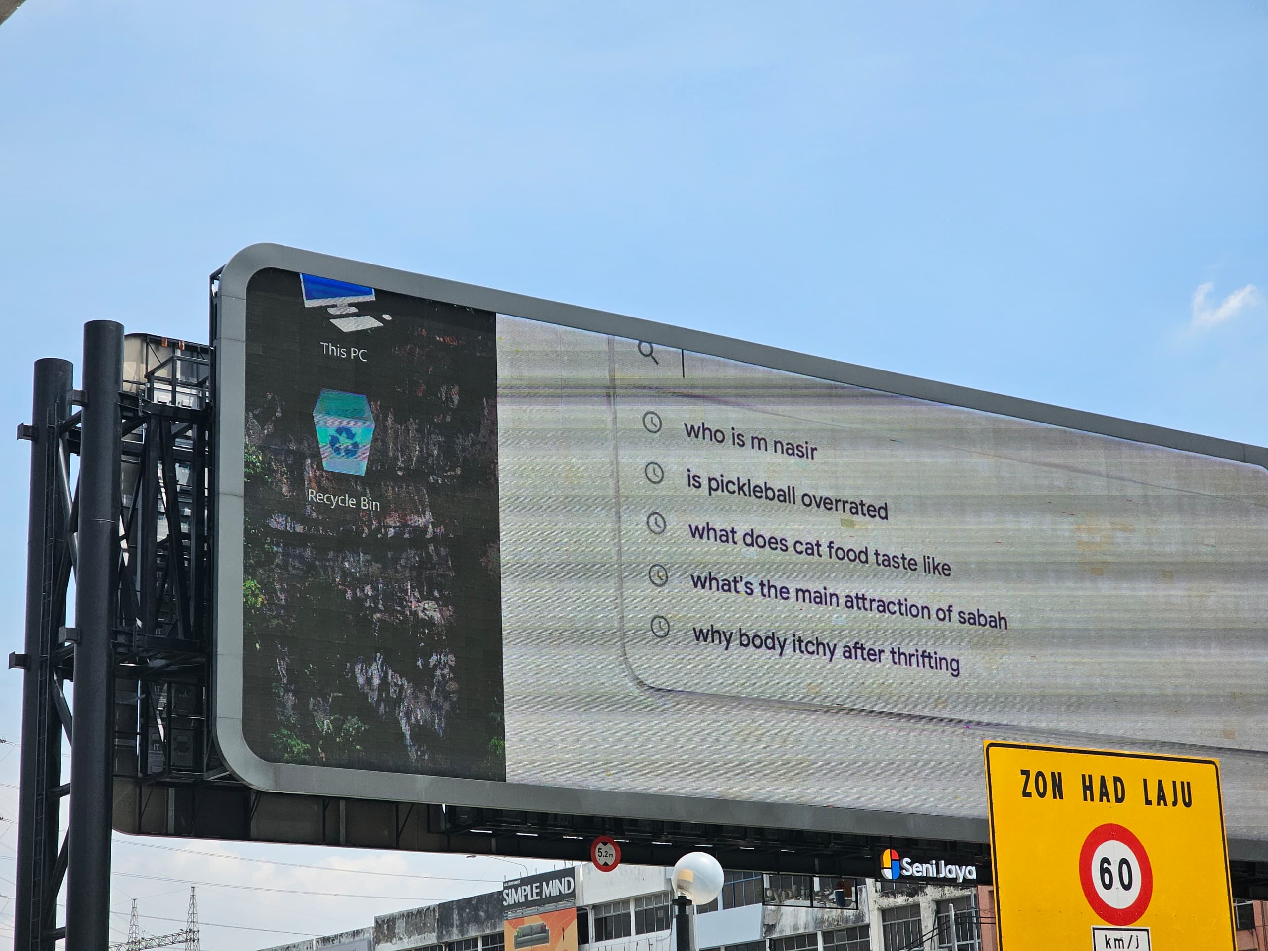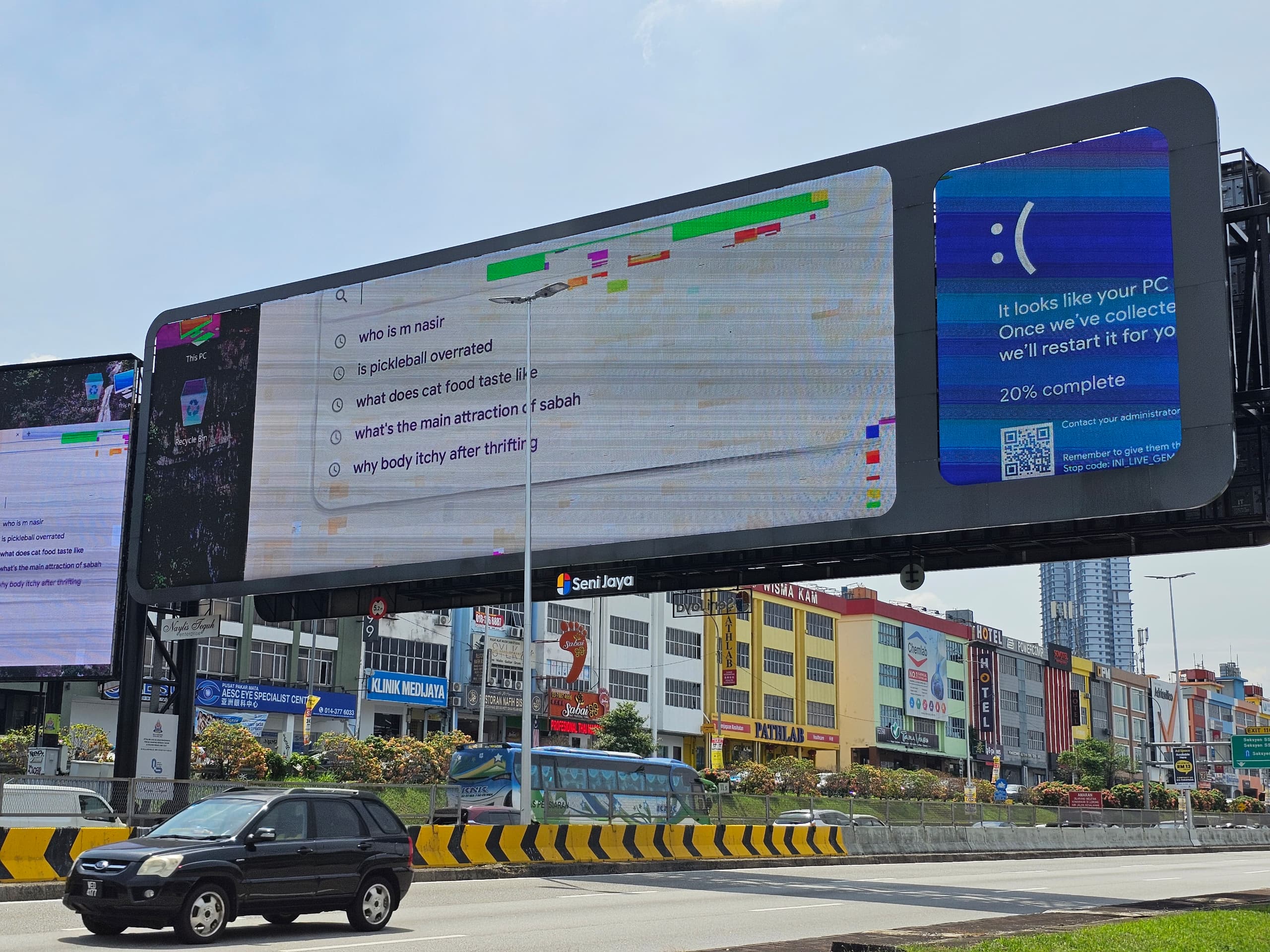 Instead of the usual displays one would expect on a giant billboard, commuters were greeted with a very relatable desktop error screen and search history that included a very, shall we say, human list of queries.