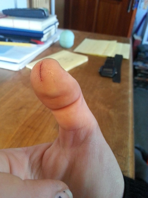 Luka di jempolnya, biar romantis gitu deh. Eaaaaaa.