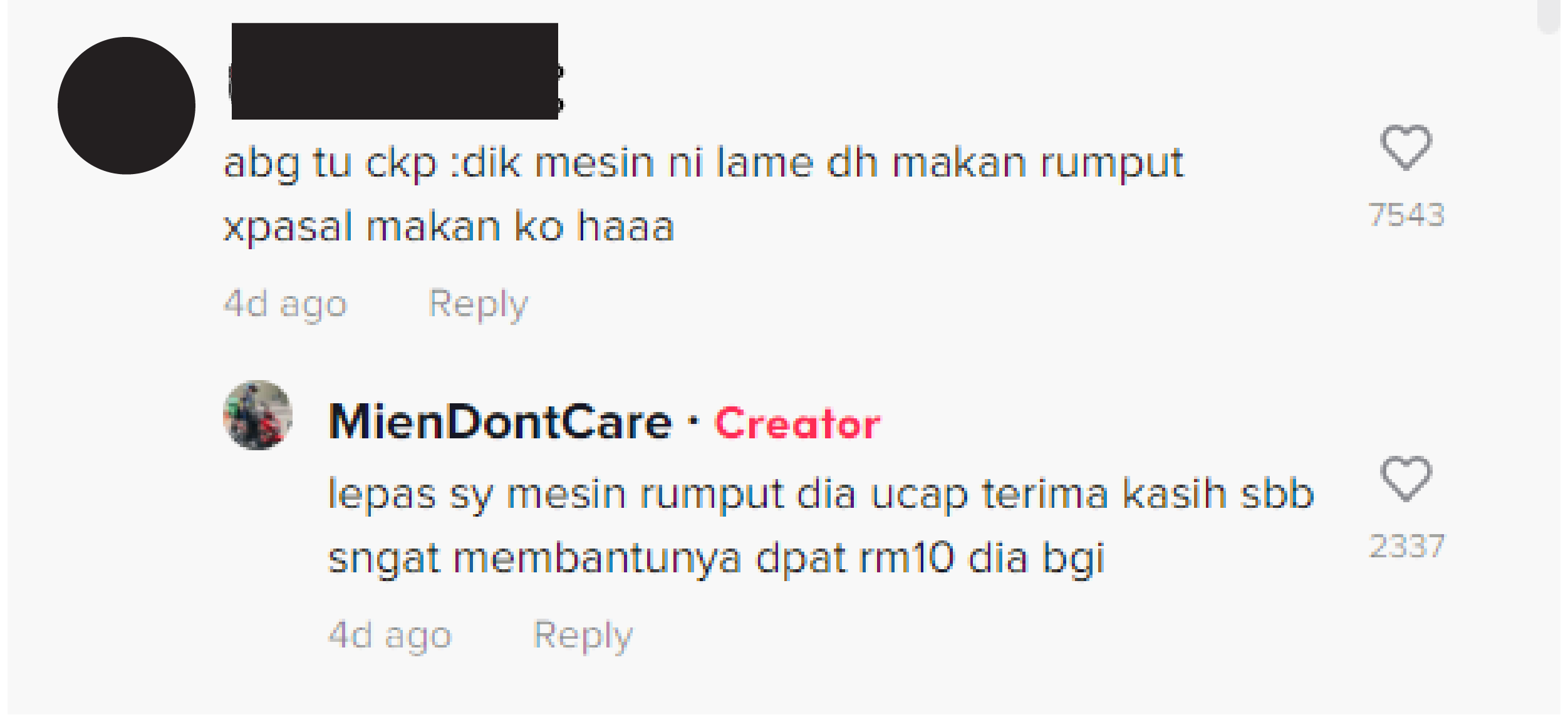 The rider responded by saying, "After I (used) the brush cutter, he thanked me for being so helpful, (and) he gave me RM10."