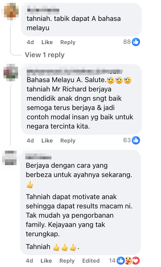 "Congratulations! Salute on getting an A in Malay," said a Facebook user.