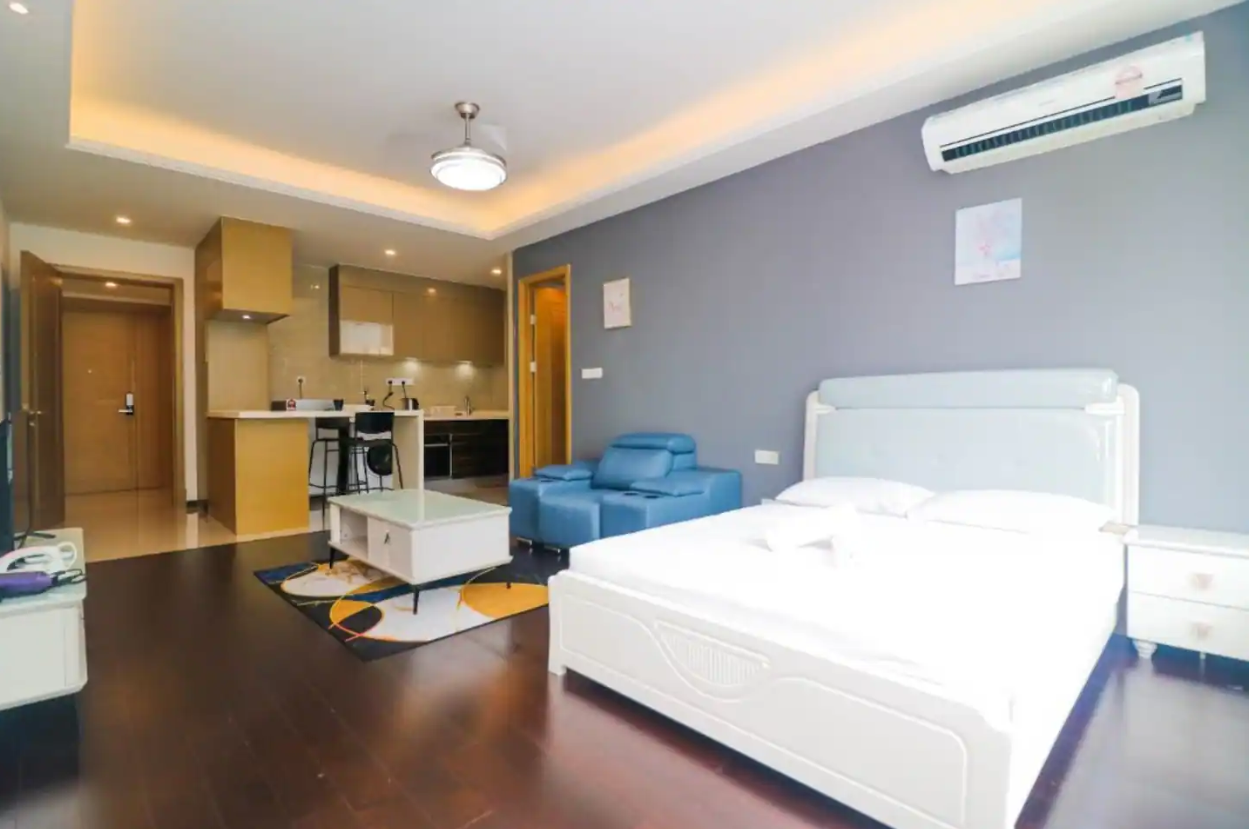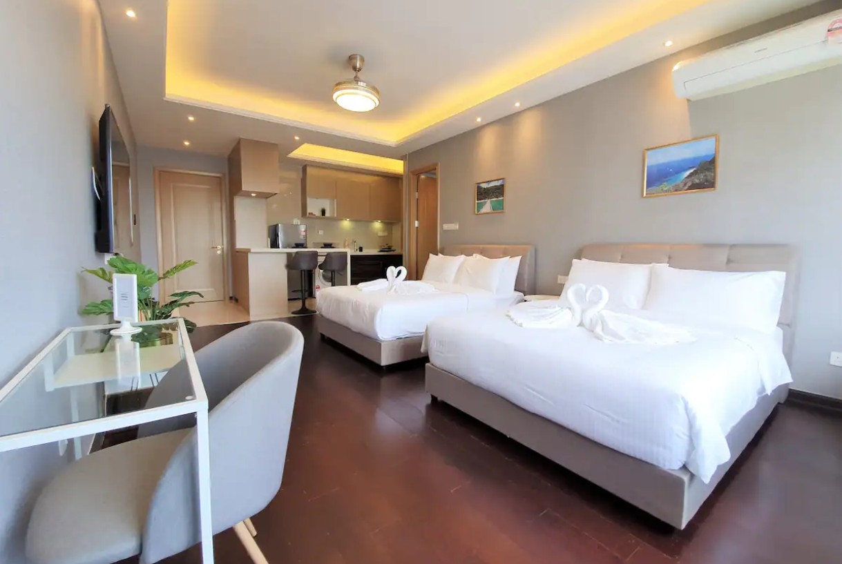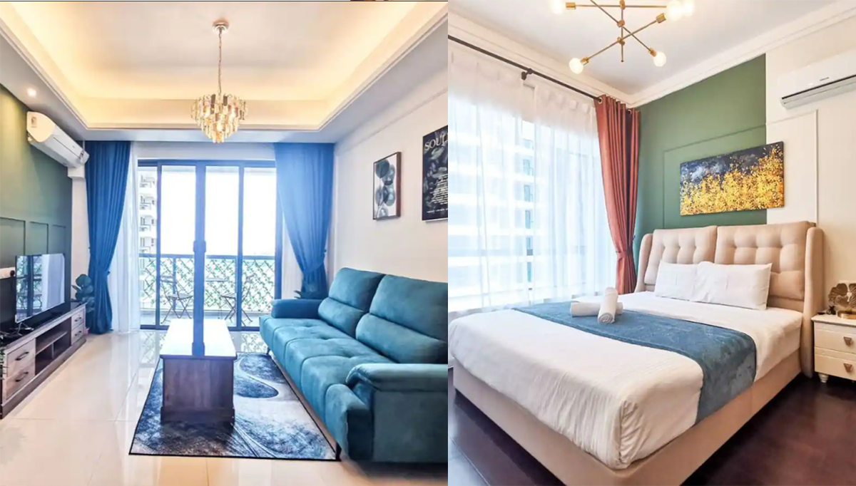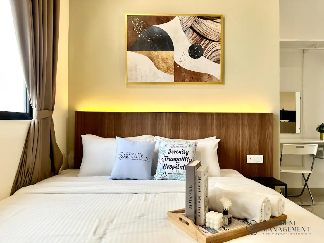 Located right above R&F Mall and just eight minutes sheltered walking distance from the Johor Bahru Customs, Immigration and Quarantine complex (CIQ), this studio apartment comes with two queen-sized beds that can accommodate up to four adults with an air-conditioned living space, WiFi, and a kitchen equipped with utensils for light cooking.