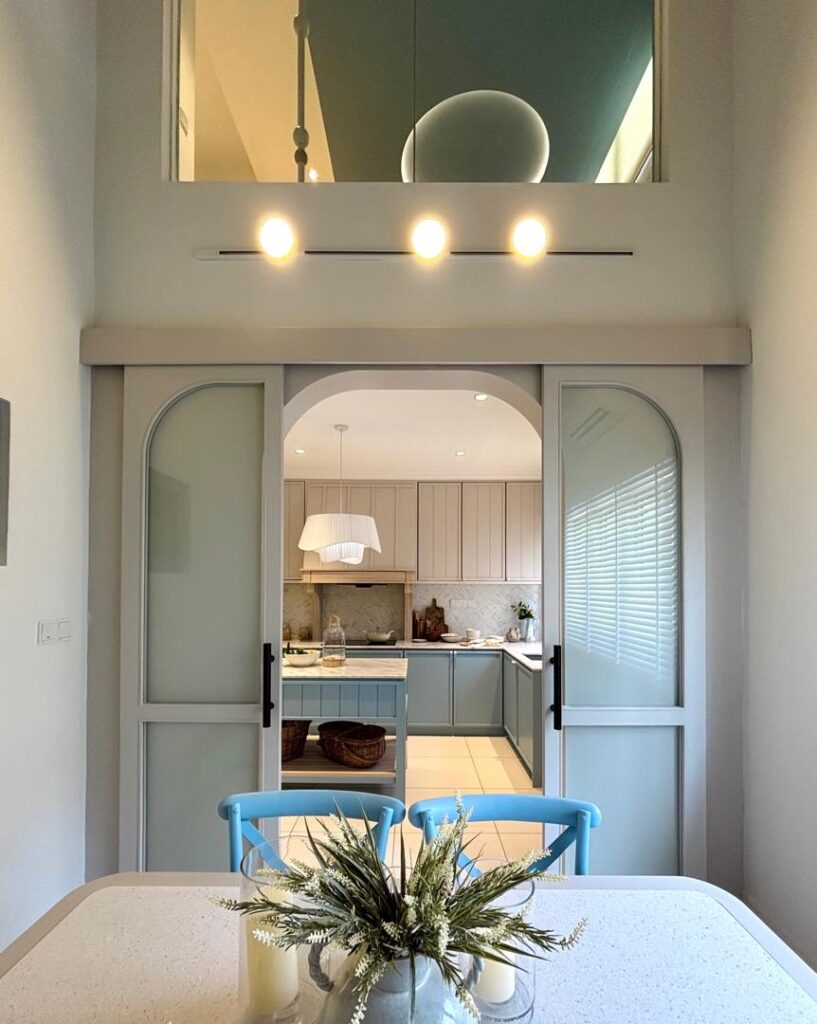 Adjacent to the kitchen is an open-plan area anchored by an ultra-high ceiling that rises into the upper floor, creating a flexible zone that homeowners can adapt into a striking dining area or a generous hobby space.