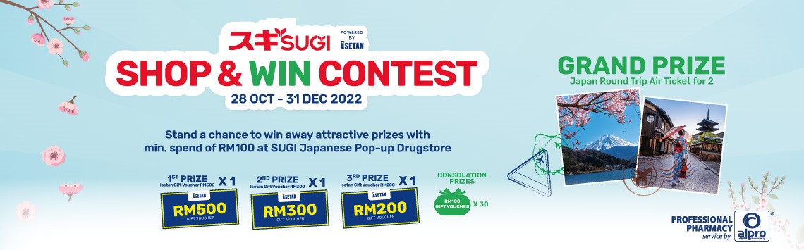 Running from 28 October to 31 December, the Shop & Win contest gives you the chance to win all kinds of amazing prizes when you spend at least RM100 at the Sugi Sugi powered by Isetan pop-up drugstore.