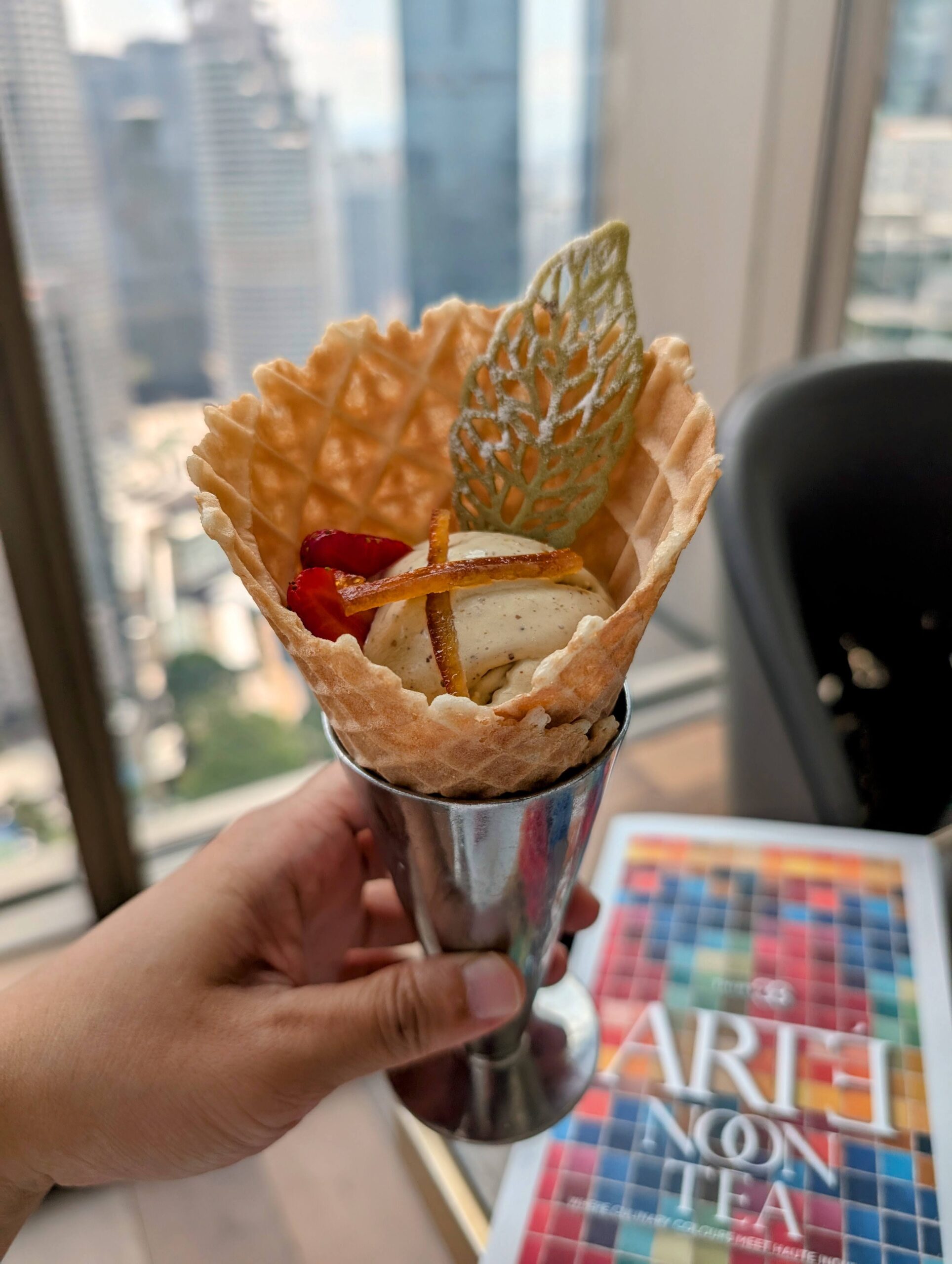 To end the experience, we were served a Citrus Pistachio Ice Cream in a waffle cone, garnished with candied orange, pistachio brittle, and strawberry