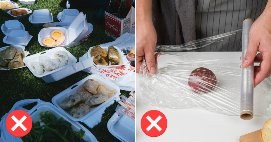 - Styrofoam: Often used for economy rice and other food items like fried rice and fried noodles. It can melt, warp, and leach chemicals when heated.