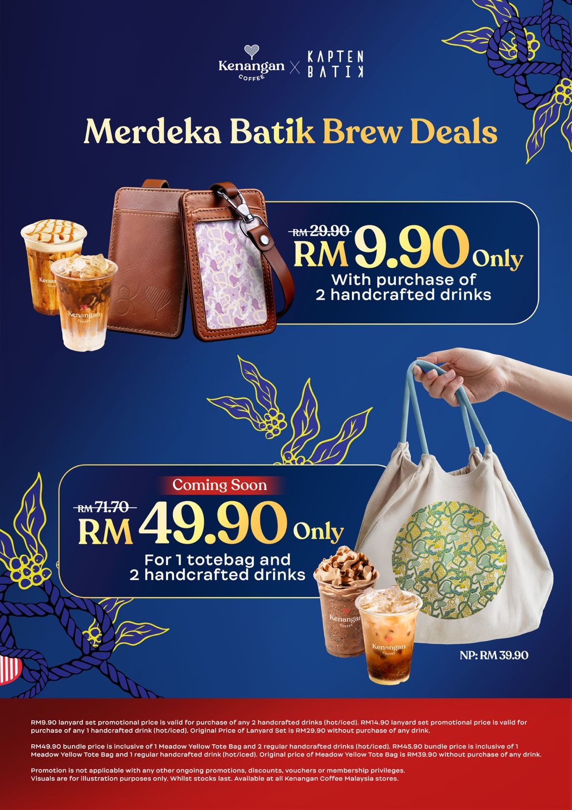 To sweeten the deal, there are even more ways to bring home something special. Top up RM150 with Kapten Batik Kenangan Pay Reload and you'll get free merchandise worth up to RM100. If you're new to the Kenangan Coffee app, you'll get two Buy 1 Free 1 vouchers plus an RM10 off voucher with terms and conditions applied. And here's a little tip for your next coffee run, wear batik on Thursdays and you'll get 15% off à la carte regular and large drinks with no minimum spend, walk-in customers only.