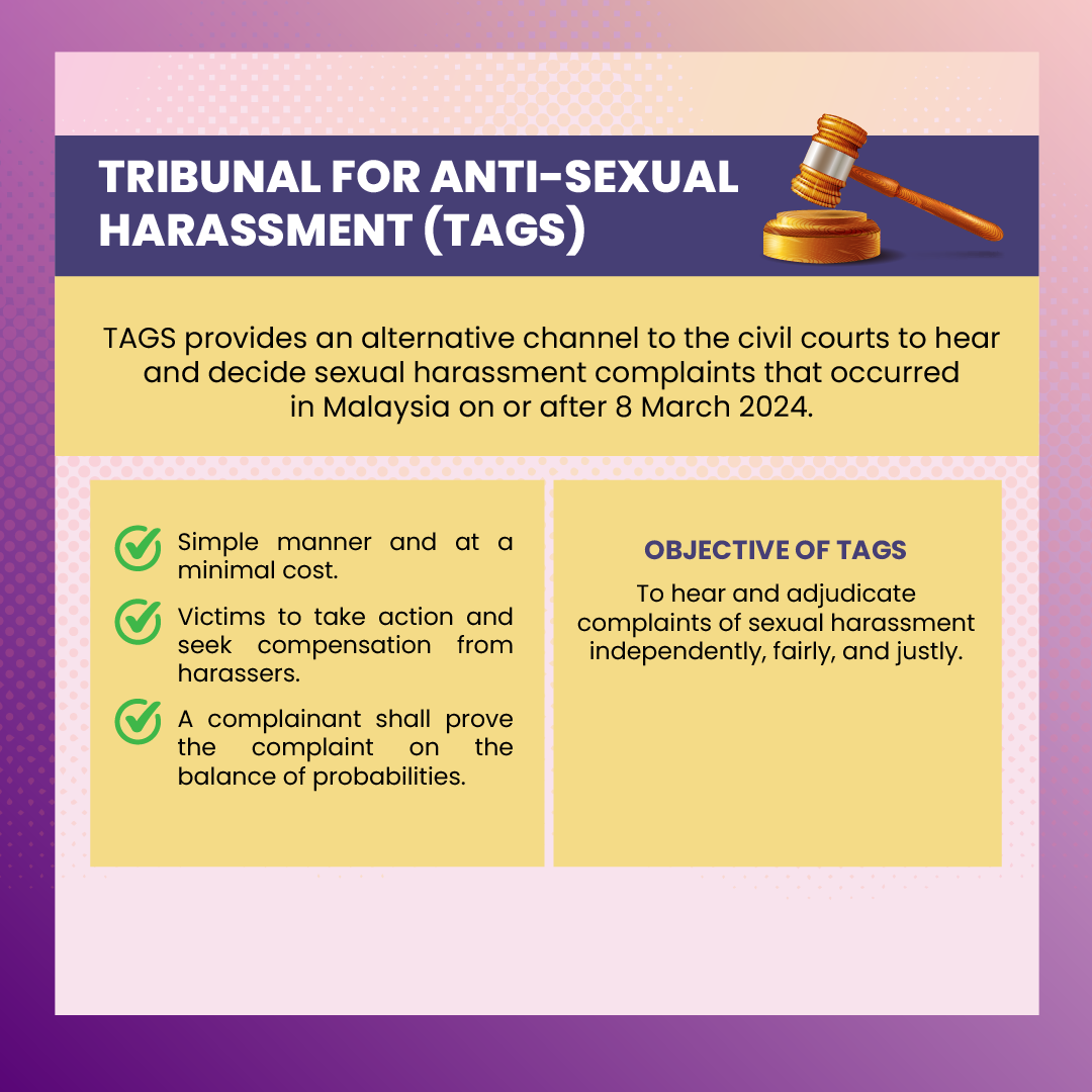To tackle this issue, the Women, Family, and Community Development Ministry (KPWKM) established TAGS (Tribunal for Anti-Sexual Harassment)