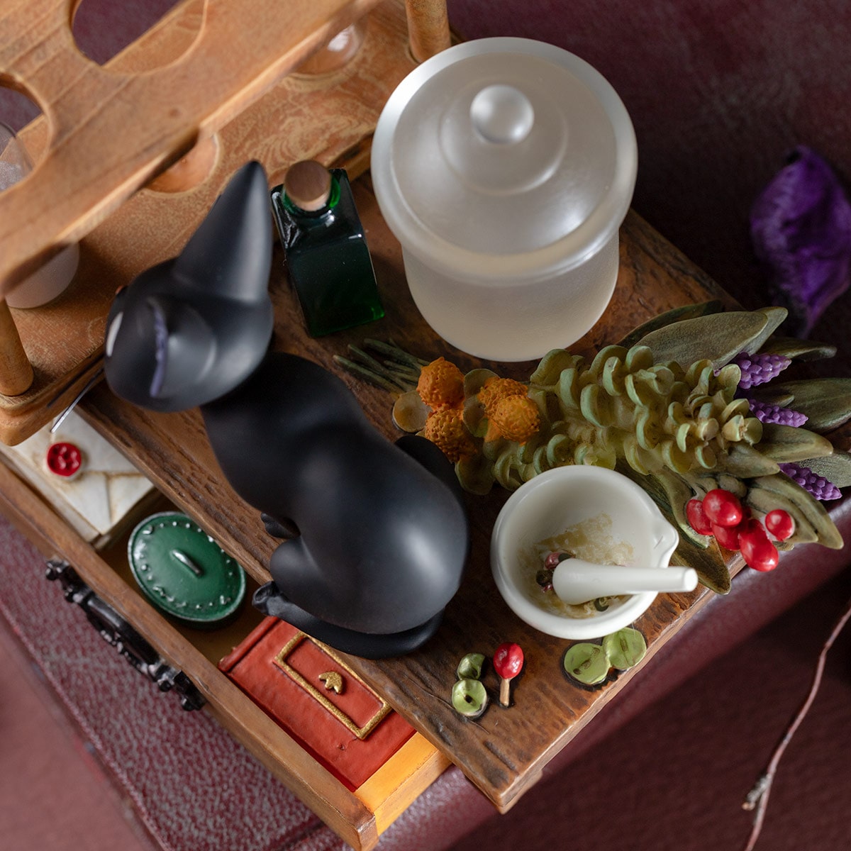 The second hourglass diorama draws from Kiki's Delivery Service, featuring the curious black cat Jiji atop Kiki's mother's potion desk