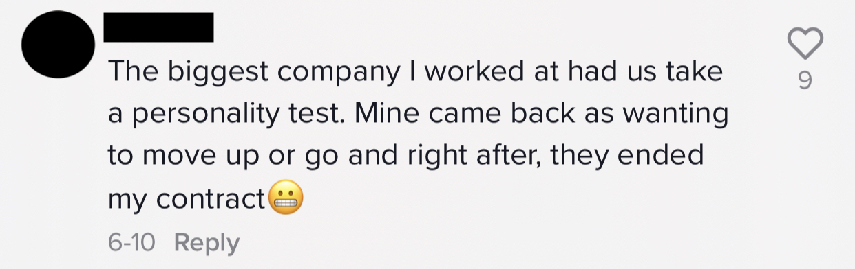 One of the most shocking comments was related to personality tests candidates normally have to take as part of their job interview process. The user stated that right after their test results came back as "wanting to move up, or go", their employer terminated their contract.