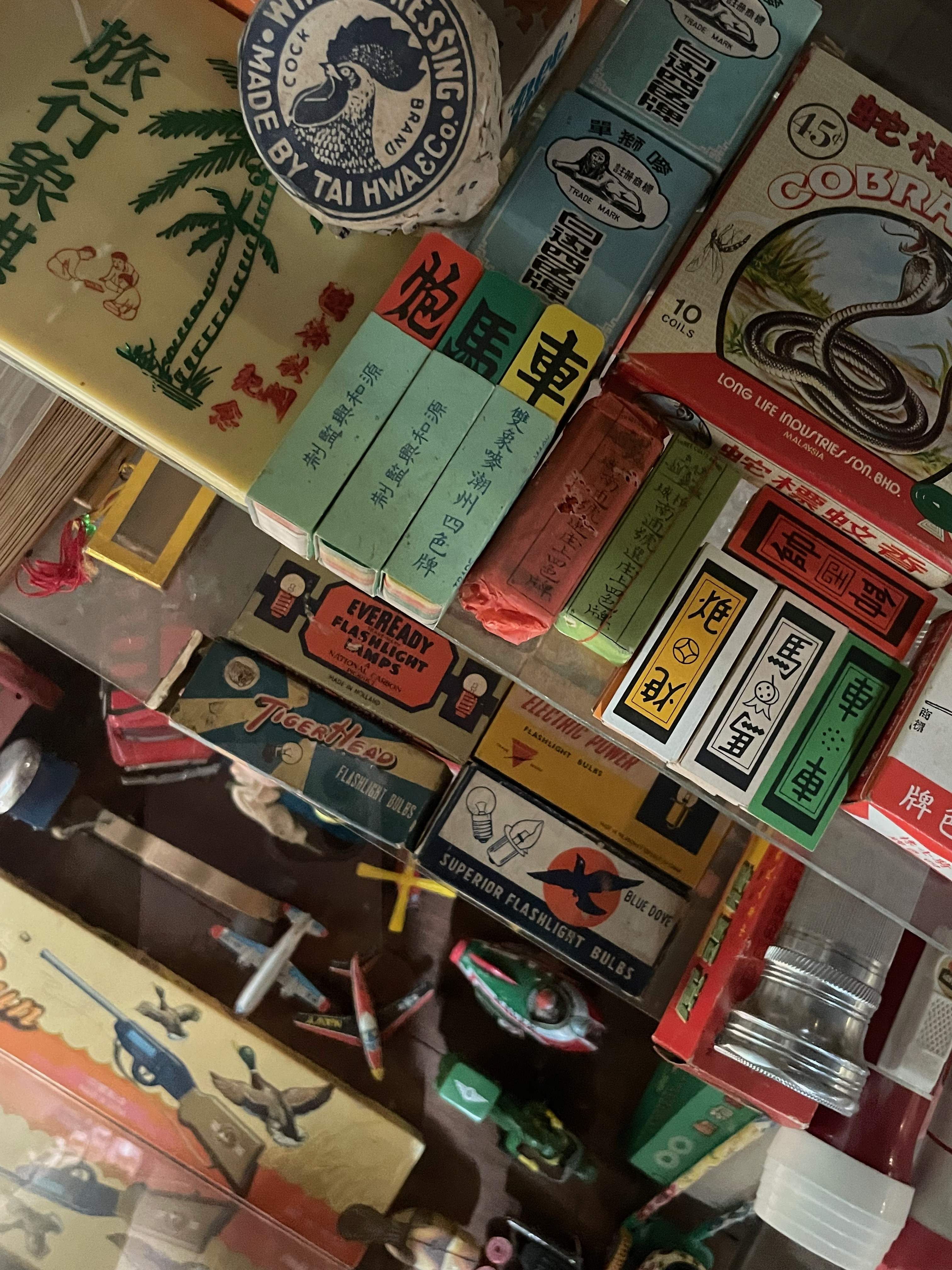 Dinnerware made from tin, old milk cans, vintage candy boxes, and toys decorate each display to recreate the scene from a kopitiam back in the day.