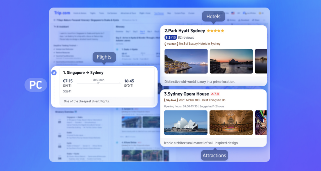 - All-in-one planning: Flights, trains, hotels, attractions and restaurants integrated into one itinerary view with real-time availability