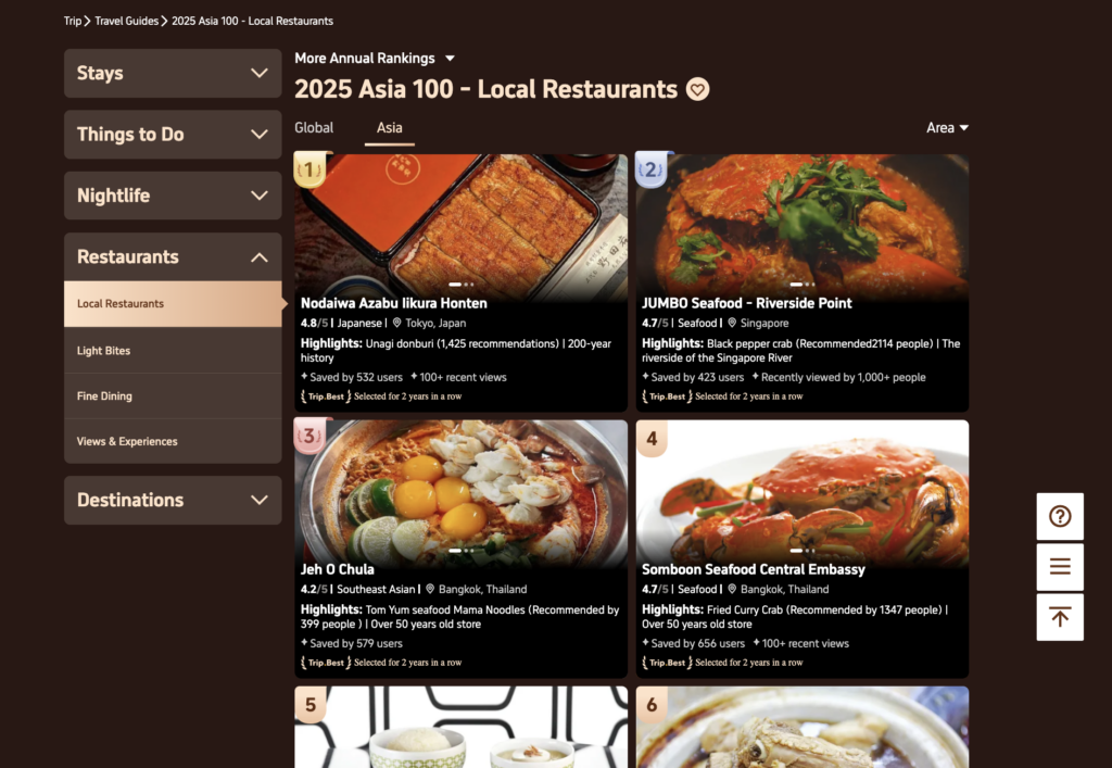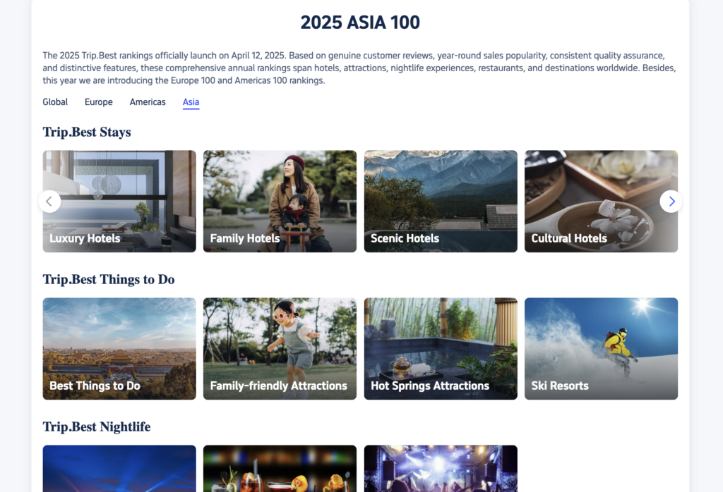 Trip.Best is Trip.com's AI-powered recommendation list that highlights the top-rated hotels, attractions, restaurants, nightlife experiences, and destinations around the globe.