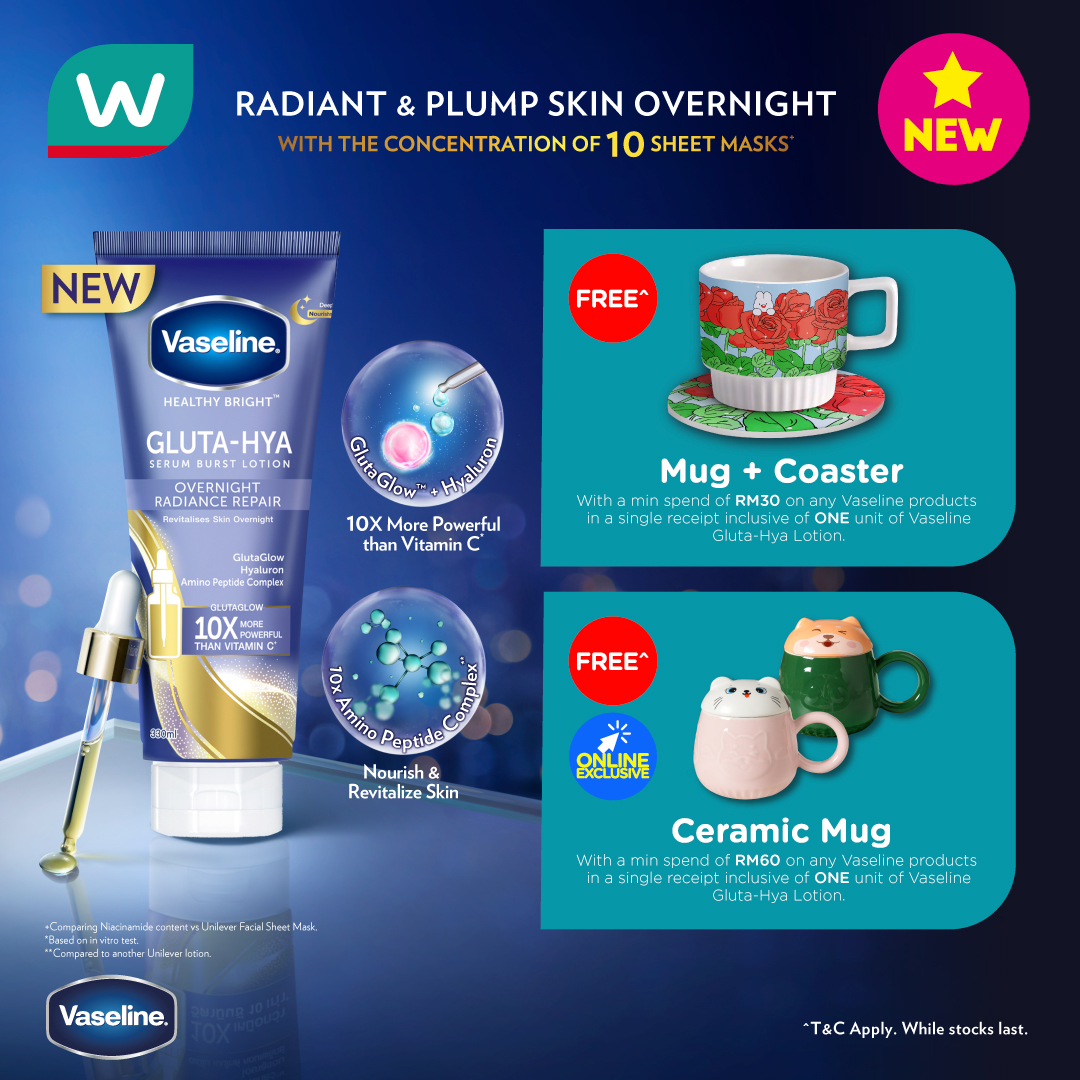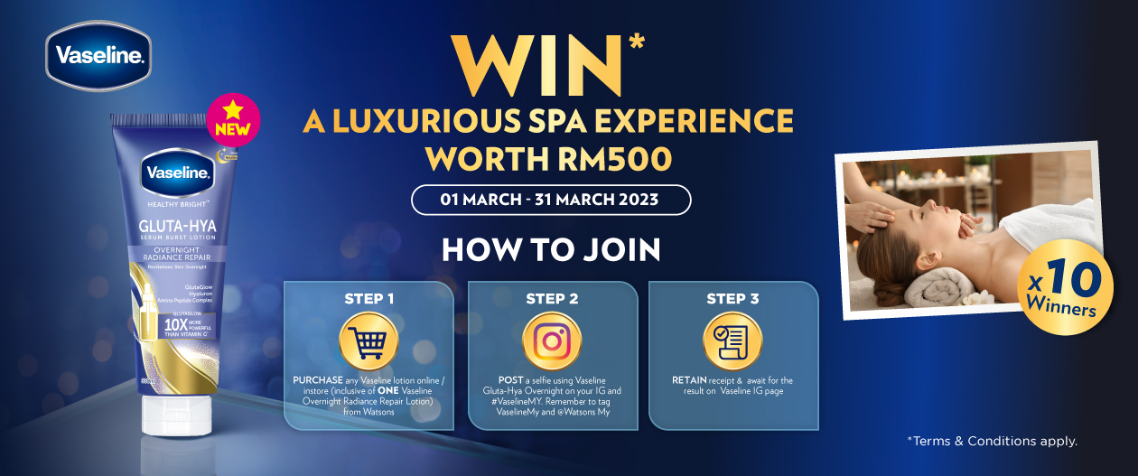 All you have to do is purchase any Vaseline lotion online or in-store from Watsons, including one of Vaseline's Overnight Radiance Repair Lotion. Then, post a selfie of you using the Gluta-Hya Overnight lotion on your Instagram with the hashtag, #VaselineMY. Don't forget to also tag @vaslinemy and @watsonsmy in your post. Lastly, make sure to keep your receipt carefully and check on Vasline's Instagram page for the results.
