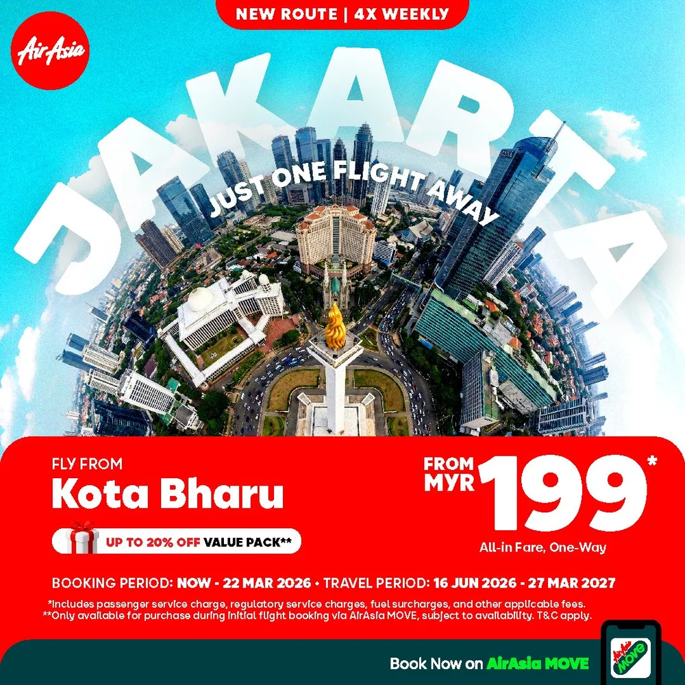 In conjunction with the launch, AirAsia is offering promotional one-way fares from Kota Bharu to Jakarta