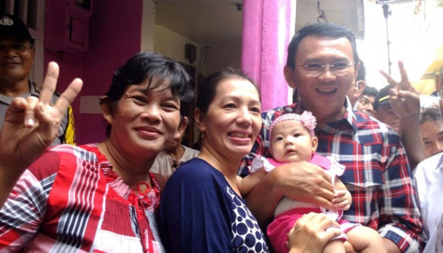 Calon Gubernur DKI Jakarta Basuki Tjahaja Purnama menggendong seorang anak dari salah satu warga Pejaten Timur, Pasar Minggu, Jakarta, 3/11.