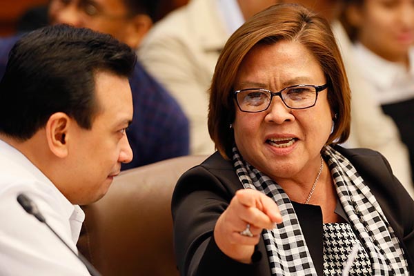 Sen. Leila De Lima gestures as she talks to Sen. Antonio Trillanes IV at the Senate probe on the rising number of extrajudicial killings related to President Rodrigo Duterte's "War on Drugs", Aug. 23, 2016.