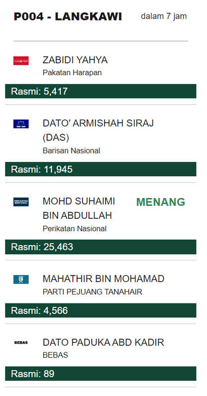 The Langkawi parliamentary seat was won by Perikatan Nasional's (PN) Datuk Suhaimi Abdullah