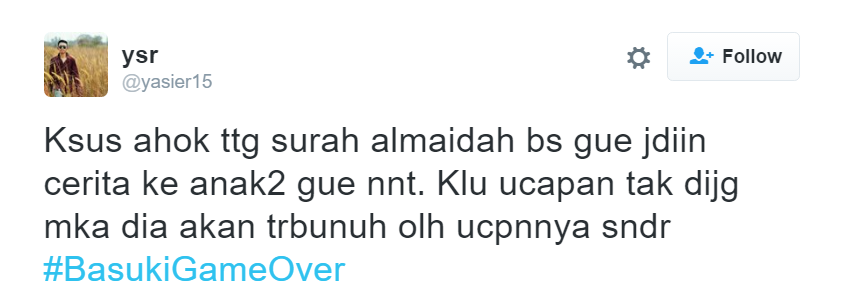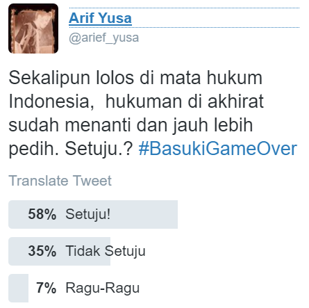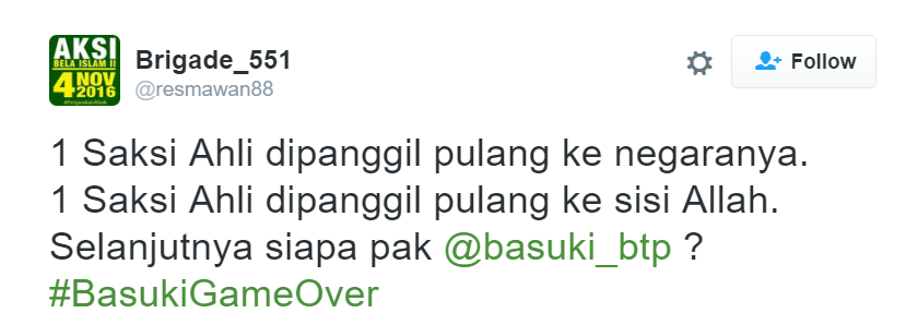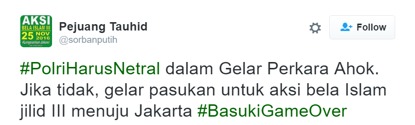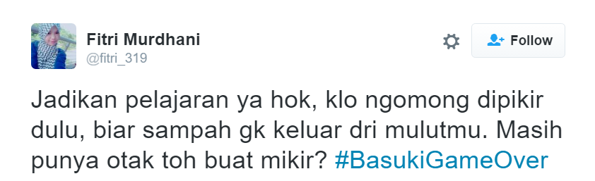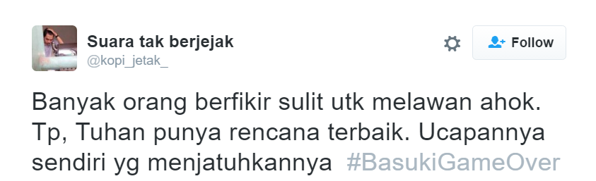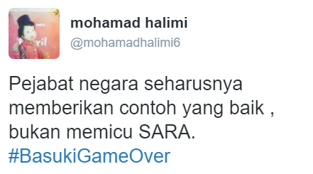 Cover image via SAYS IndonesiaWalaupun gelar perkara Ahok yang dianggap menistakan agama baru [dimulai hari ini] (http://news.liputan6.com/read/2652139/polri-gelar-perkara-kasus-ahok-hari-ini), netizen sudah menyuarakan pendapat mereka dengan hashtag #BasukiGameOver