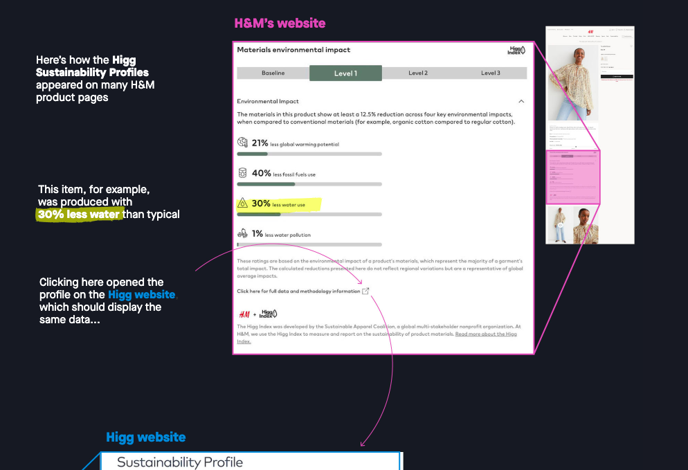 In an astounding error, H&M displayed specifics that were an inverse of a garment's actual impact on the environment. In the report, Quartz stated, "Those errors came about because the retailer's website ignored negative signs in Higg Index scores. For instance, a dress with a water-use score of -20% — as in, it uses 20% more water than average — was listed on H&M's website as using 20% less."