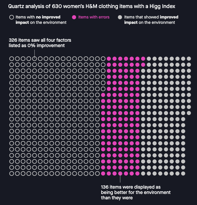 "On the days Quartz logged the data, over 600 items of women's clothing were listed as having Higg Sustainabililty Profiles. Most showed no improvement whatsoever." Analysing 630 women's clothing items with the Higg Index, Quartz found only 27% of the items having showed an improved impact on the environment.