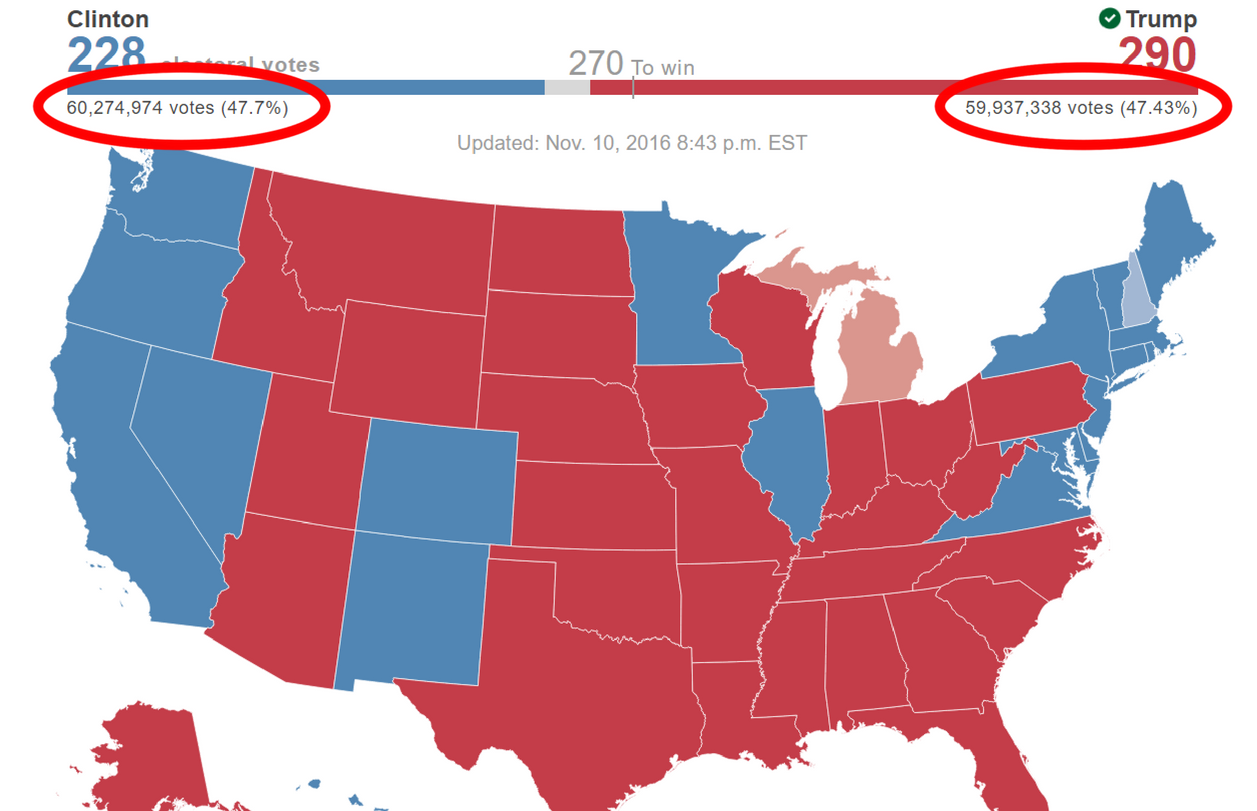 Jika kamu perhatikan, jumlah suara yang diperoleh Hillary lebih banyak dari Trump.