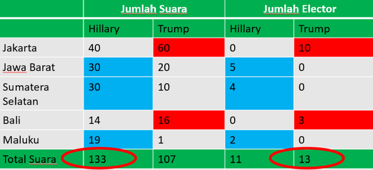 Oke, anggaplah pemilu Amerika diikuti oleh 5 provinsi, Jawa Barat (50 penduduk), Jakarta (100 penduduk), Sumatera Selatan (40 penduduk), Bali (30 penduduk), dan Maluku (20 penduduk).