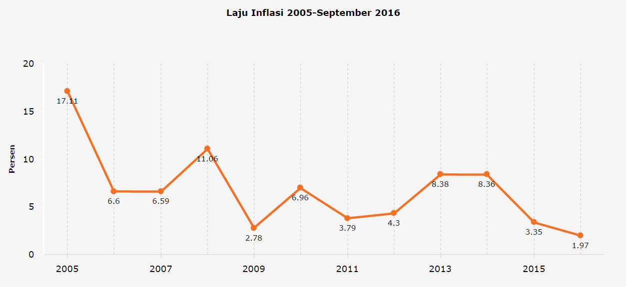 Pada tahun 2014, inflasi sempat melonjak ketika harga BBM dinaikkan. Meski begitu, **inflasi menjadi jauh lebih rendah pada tahun 2015 dan 2016**. Hal ini dikarenakan pembangunan infrastruktur yang membuat biaya distribusi lebih rendah serta kerjasama dengan pemerintah daerah melalui Tim Pengendali Inflasi Daerah (TPID).