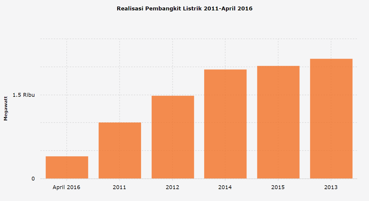 Dari target penambahan 7.000 MW per tahun, sejauh ini realisasinya hanya [1.717 MW per tahun] (http://databoks.katadata.co.id/datapublish/2016/10/14/5-tahun-realisasi-pembangunan-pembangit-listrik-jauh-dari-cukup)