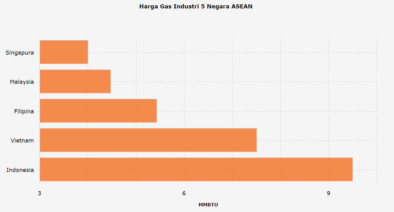 Harga gas Indonesia adalah $9,5 per satu juta British thermal unit (mmBTU). Sementara harga gas Malaysia dan Singapura kurang dari setengahnya.