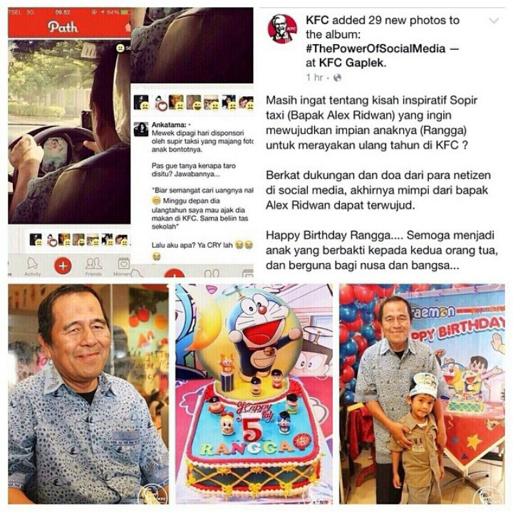Satu lagi kicauan *netizen* berhasil membawa dampak positif bagi hidup seseorang. Kali ini adalah akun *Path* atas nama Ankatama. Dalam status yang ia tulis, dikenalkanlah kita kepada sosok bernama Alex Ridwan, sopir dari taksi yang ia tumpangi yang memajang foto anak terakhirnya yang kemudian diketahui bernama Rangga.