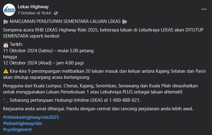 The Kajang–Seremban Expressway (LEKAS) will be temporarily closed this weekend, 11 and 12 October, to accommodate the RHB LEKAS Highway Ride 2025