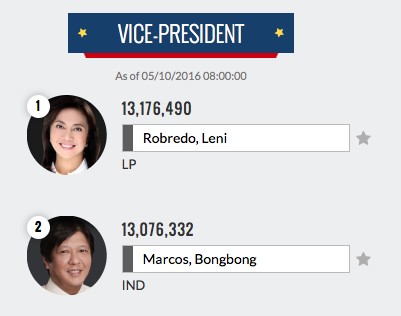 Cover image via GMA NewsThe partial and unofficial results of GMA News show that Leni Robredo is now leading the VP race by 100,000 votes as of publishing