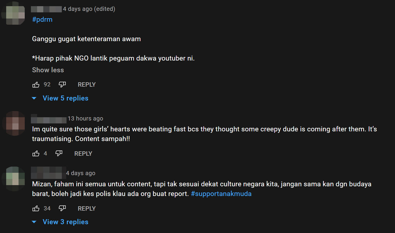 "I'm quite sure those girls' hearts were beating fast because they thought some creepy dude is coming after them. It's traumatising. Content sampah (trash)!" added another YouTube user.