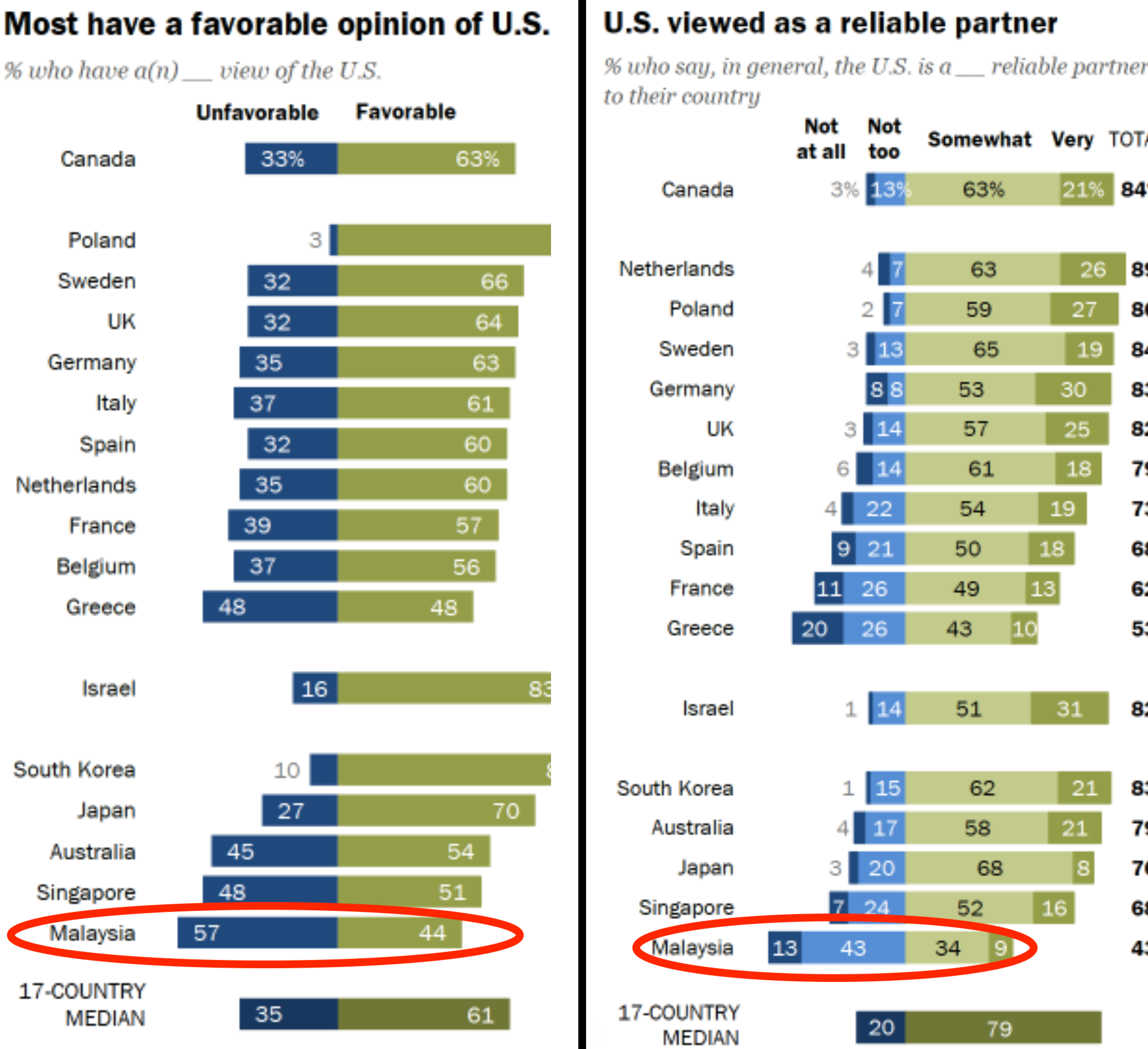 These statistics seem to carry forward towards the perception of the US as a reliable partner, with Malaysia once again ranking them unfavourably. 56% of Malaysian surveyees were said to have little to no confidence in the US when it comes to reliability.
