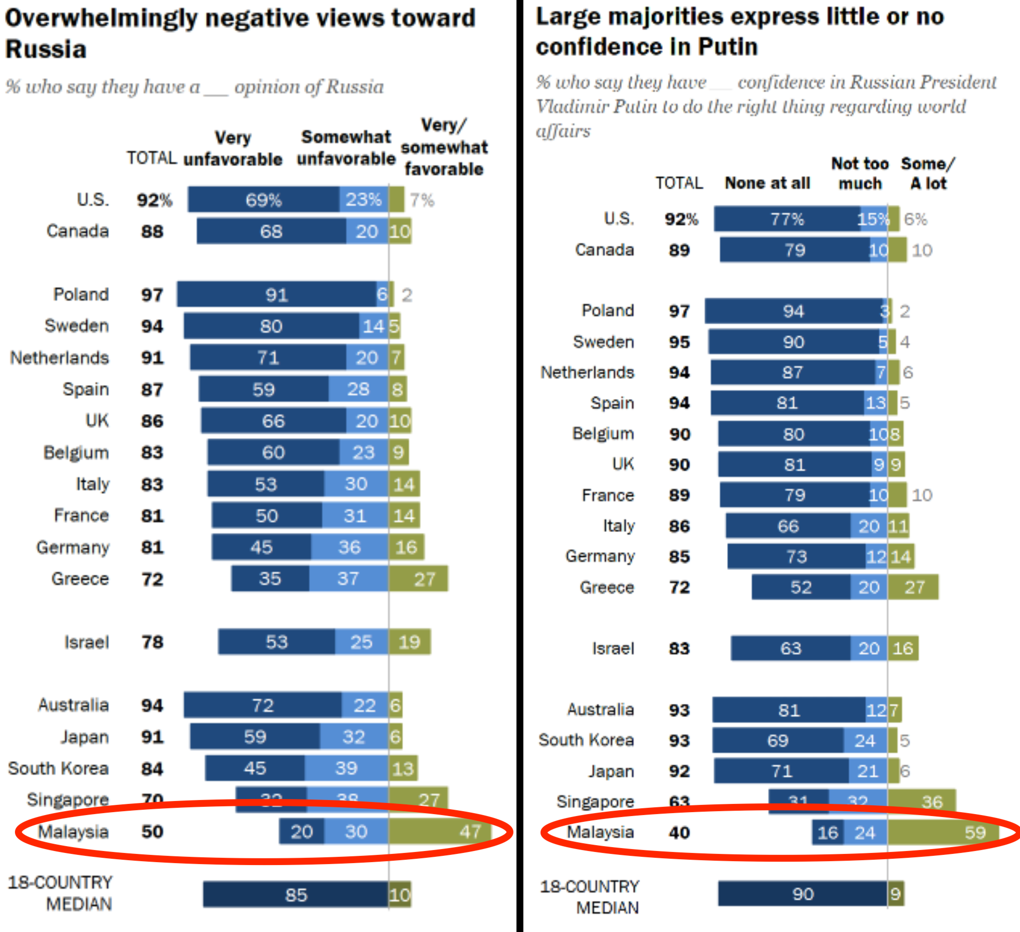 The only country with mixed reviews, 50% of Malaysian surveyees still maintained an unfavourable view towards Russia, though this was the lowest unfavourable margin among all 18 countries.