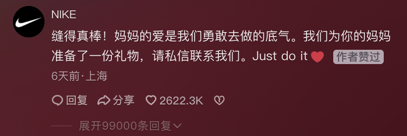 Even Nike's official account responded to the viral post, saying, "Great stitching! A mother's love is often the courage we need. We have prepared a gift for your mother. Please message us."