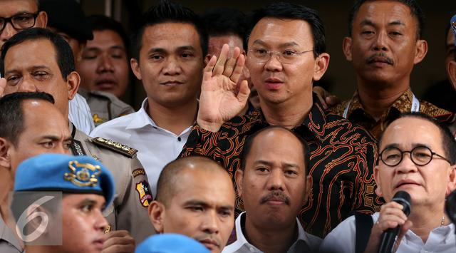 Ahok bersama tim suksesnya setelah diperiksa di Bareskrim Polri, Jakarta (7/11).