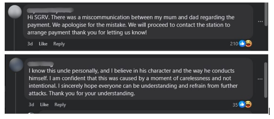 A commenter claiming to be the couple's child apologised, explaining that there was a "miscommunication between my mum and dad regarding the payment". The family stated they would contact the station immediately to settle the bill.