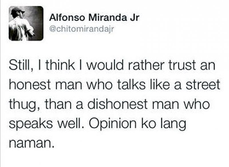 "Alam nyo naman na Duterte ako mula dati dahil bilib talaga ako sa nagawa nya para sa Davao eh. Pero pinag-aaralan ko talaga ng todo yung desisyon ko by comparing Duterte's platform and track record with those of the other candidates."
