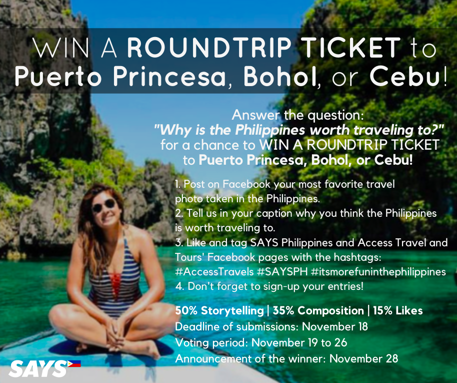 Follow the contest details on our [Facebook page] (https://www.facebook.com/SaysPhilippines/photos/a.372889739433452.88065.371927962862963/1126287004093718/?type=3&theater)!