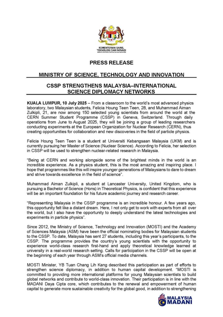 Image via Akademi Sains Malaysia (Facebook)Sejak tahun 2012, Kementerian Sains, Teknologi dan Inovasi (MOSTI) bersama Akademi Sains Malaysia (ASM) telah menjadi badan pencalon rasmi bagi menghantar pelajar Malaysia ke Program Pelajar Musim Panas CERN (CSSP).
