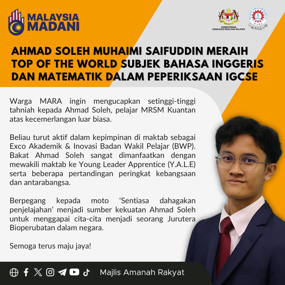 Dalam satu hantaran di Facebook Majlis Amanah Rakyat (MARA), difahamkan pelajar MRSM Kuantan, Pahang, Ahmad Soleh Muhaimi Saifuddin telah meraih markah penuh dalam subjek Bahasa Inggeris dan Matematik IGCSE.
