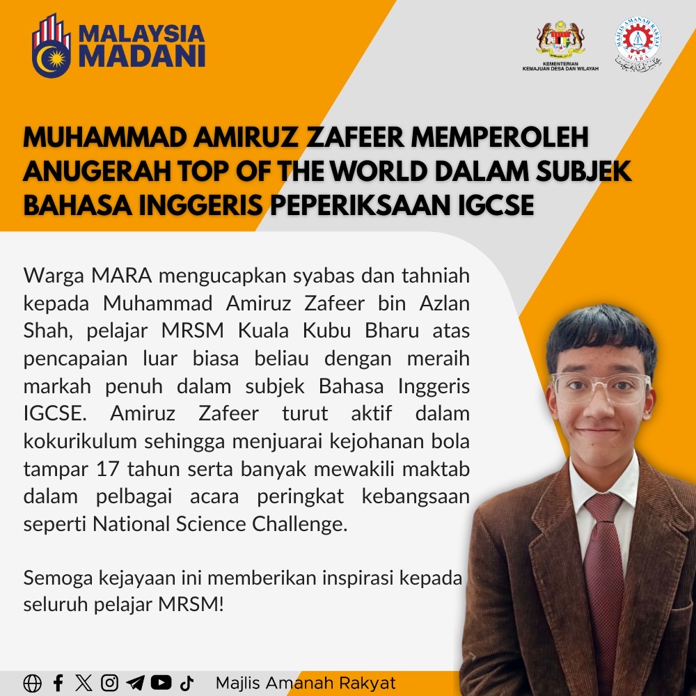 Manakala, pelajar MRSM Kuala Kubu Bharu, Selangor, Muhammad Amiruz Zafeer Azlan Shah juga mendapat markah penuh dalam subjek Bahasa Inggeris IGCSE.