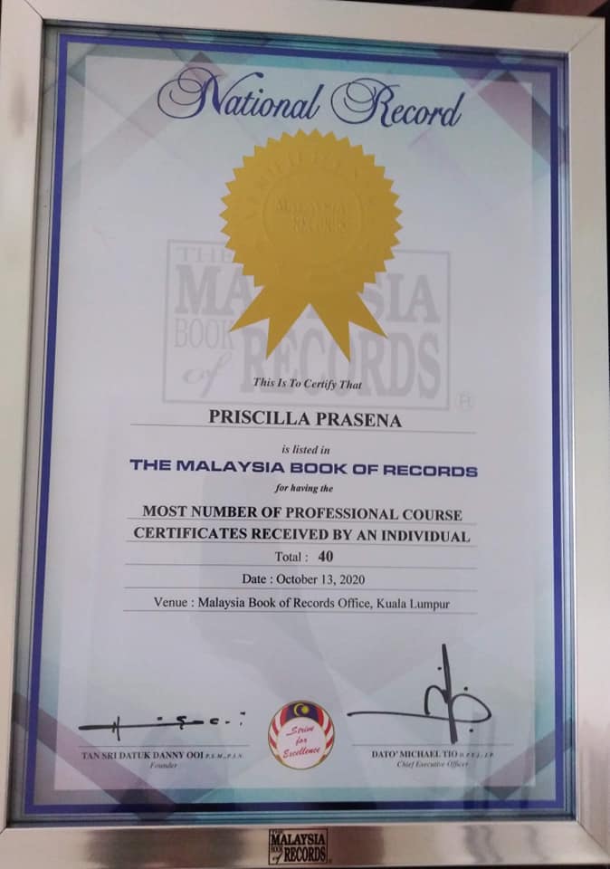 Wanita yang dikenali sebagai Priscilla Prasena itu mengambil masa hanya lima tahun untuk mendapatkan 40 sijil profesional sehingga kejayaannya dicatatkan dalam 'Malaysia Book of Records'.
