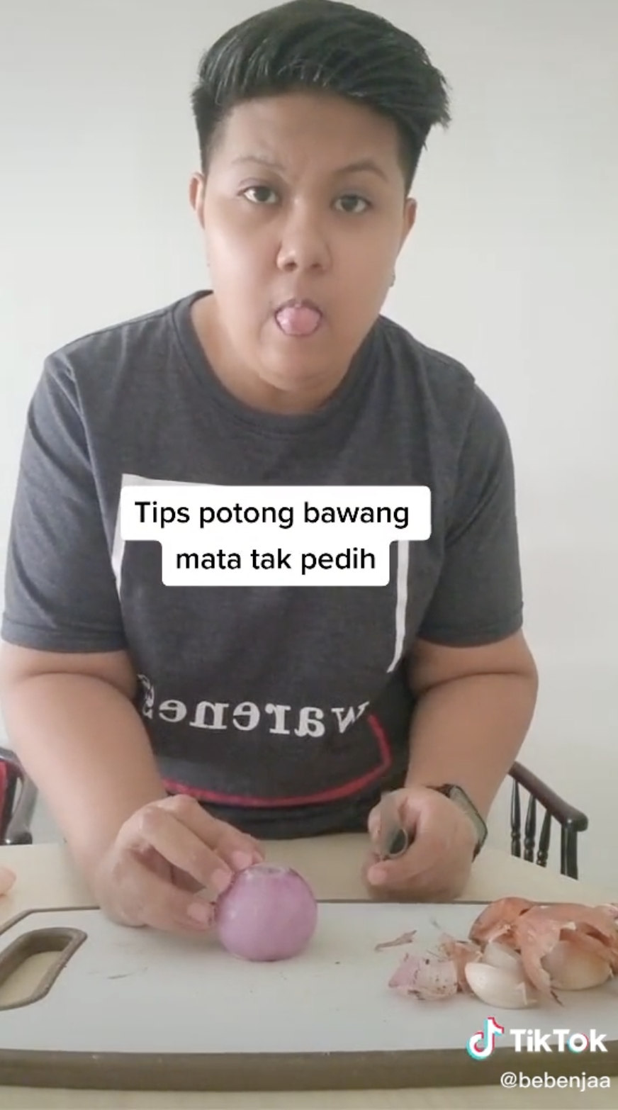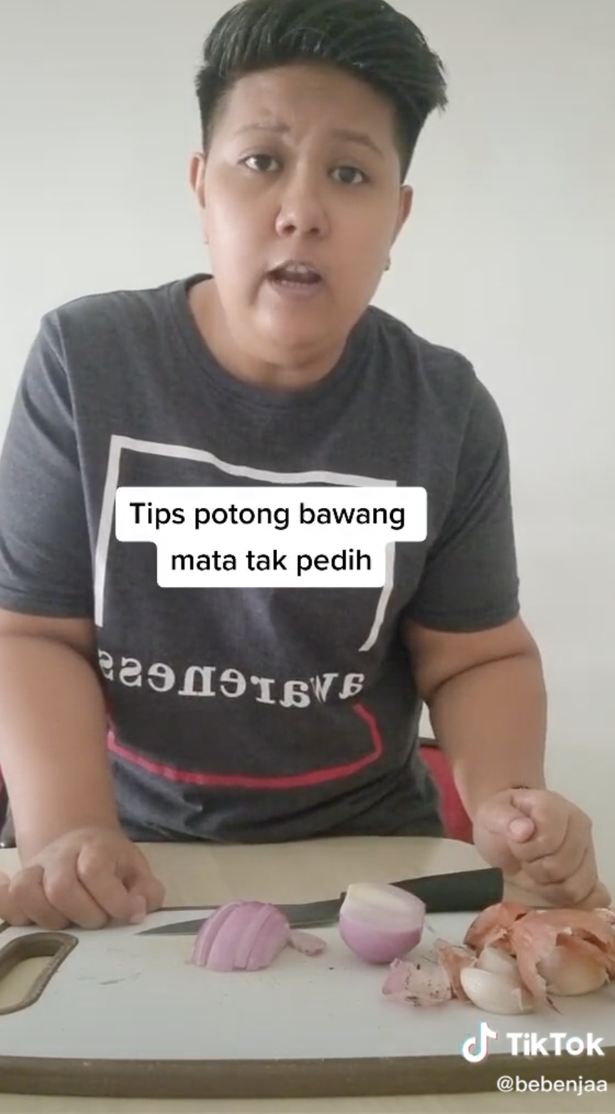 Menerusi video tersebut, kelihatan seorang pengguna TikTok yang menggunakan nama @bebenjaa sedang memberikan tips memotong bawang.