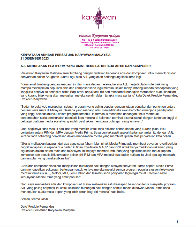 "Jadi saya menasihati artis dan komposer untuk elak melakukan satu kesilapan besar dan terus menyertai program AJL yang paling berprestij ini untuk kekalkan hubungan baik dengan semua media di bawah Media Prima serta menentukan suatu masa depan yang lebih cerah bagi diri mereka," kata beliau lagi.