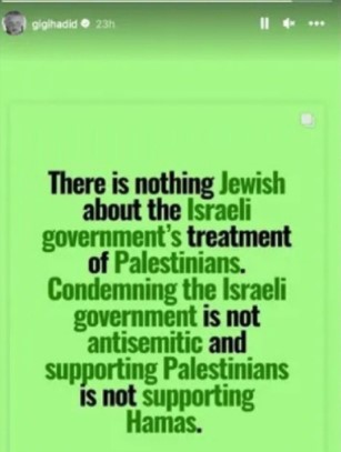 Dalam Instagram Story hantaran selebriti itu menyatakan "Tiada yang Yahudi tentang layanan kerajaan Israel terhadap rakyat Palestin. Mengutuk kerajaan Israel bukan antisemitik dan menyokong rakyat Palestin tidak bermakna menyokong Hamas."